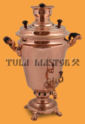 Самовар: - объем 7 литров - высота самовара 50 см - ширина самовара по ручки 39 см - материал: латунь, покрытая медью (красноватый цвет) - растапливается с помощью дров или шишек - вес самовара 6,3 кг Производитель Тула Труба для самовара в ПОДАРОК!