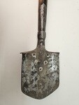Армейская лопатка с прямоугольным штыком периода Первой Мировой войны, Российская империя, штамп 1916 г., произведена на Лопатном и вилопрокатном заводе "Карл Шпигель" в городе Санкт- Петербург Лопата выполнена из высококачественной стали, черенок из дерева Штамп, ковка, кольцо, мощная сталь, добротный черенок и мастерское исполнение — всё это делает её лучшей среди всех образцов, принимавшихся на вооружение, вплоть до наших дней (на снабжение Красной Армии шли подобные, но уже с более слабой сталью, с 1941г. пошла "упрощёнка" — без кольца, с 1942- вообще штамповка с обхватом под черенок, те же, что сегодня поступают в Российскую армию, ни чета прошлым поколениям… На лопате есть клеймо завода "К.Ш.", что означает что она произведена на завода "Карл Шпигель", выбит год производства "1916", номер 774 (видимо инвентарный номер в партии) и есть нечёткое клеймо приёмщика "Д" в круге, старшего инженерного приемщика Давыдова Ивана Алексеевича Габаритные размеры лопатки - 51 см длина, 15 см ширина, 5 см высота Вес лопаты - 850 гр. Производитель - завод "Карл Шпигель"